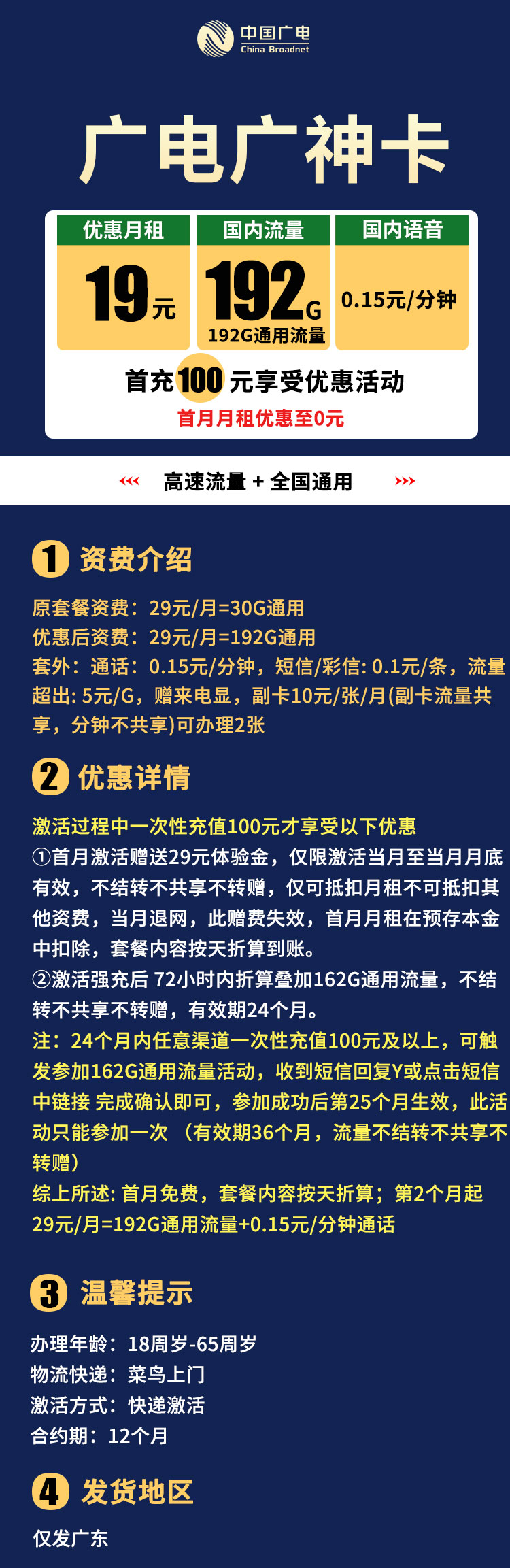 广电广神卡 29元192G通用流量 只发广东
