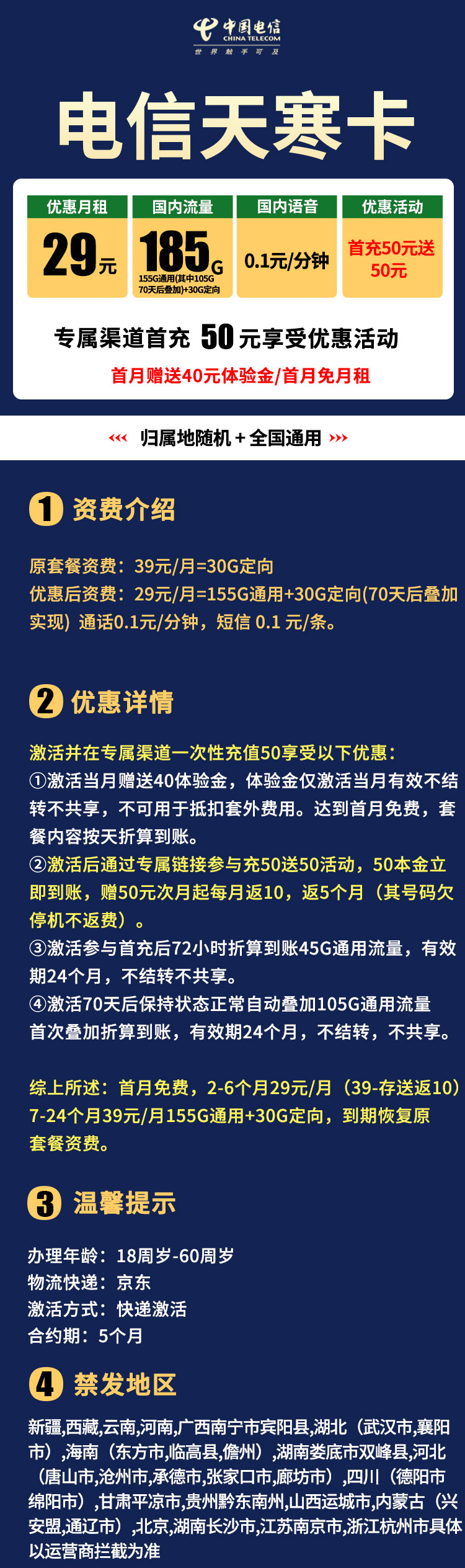 电信 天寒卡 29元155G+30G定向 首月免费【首充50送50】