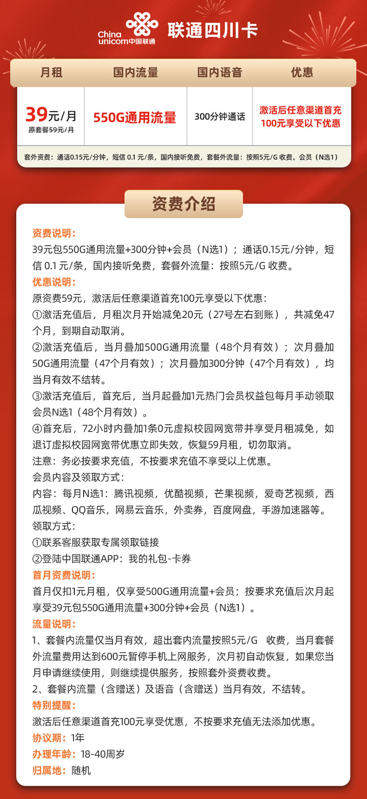 联通四川卡 39元包550G通用+300分钟+会员(仅发四川)