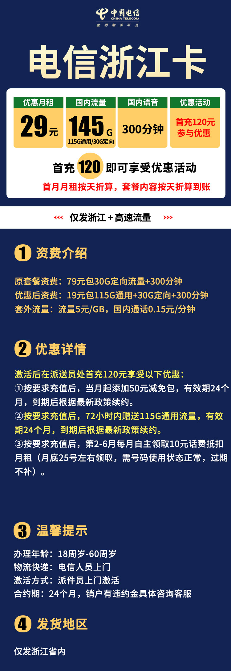 电信浙江卡 19元包115G通用+30G定向+300分钟(仅发浙江)