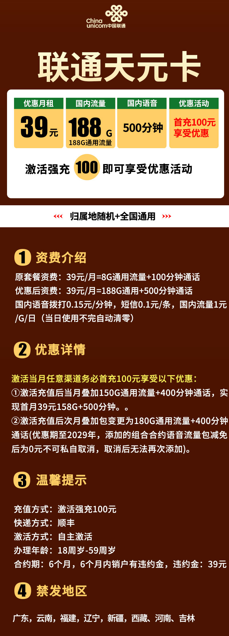 联通天元卡 39元包188G通用+500分钟【自主激活】