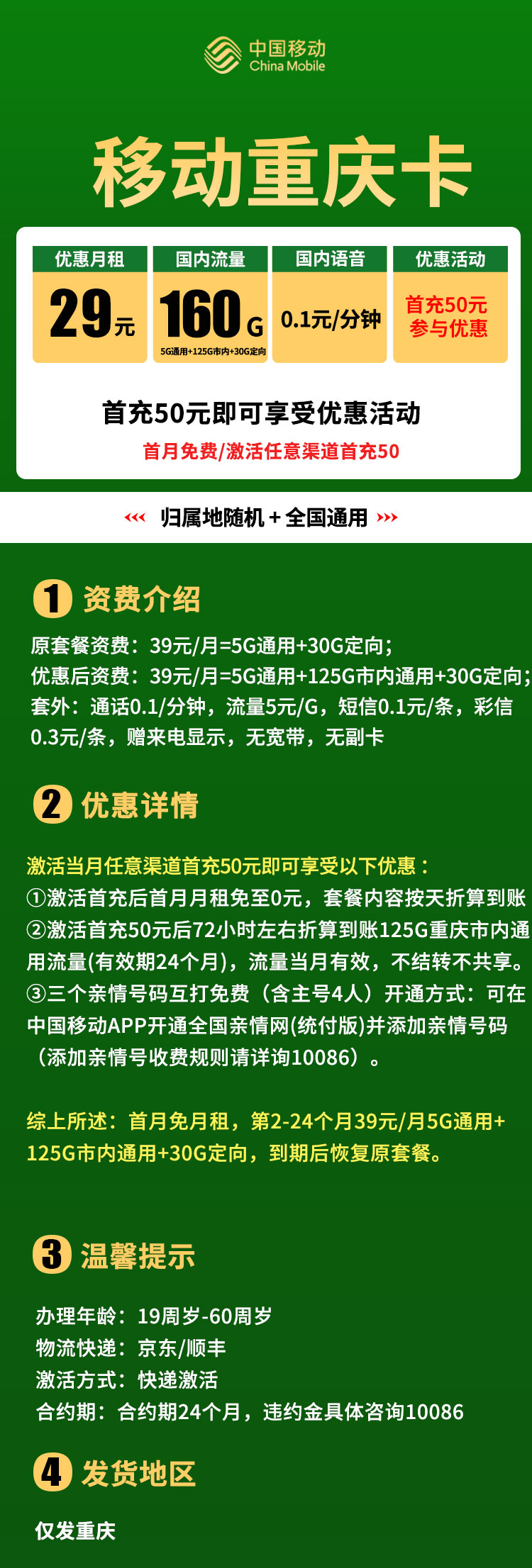 移动重庆卡 39元130G通用+30G定向 只发重庆