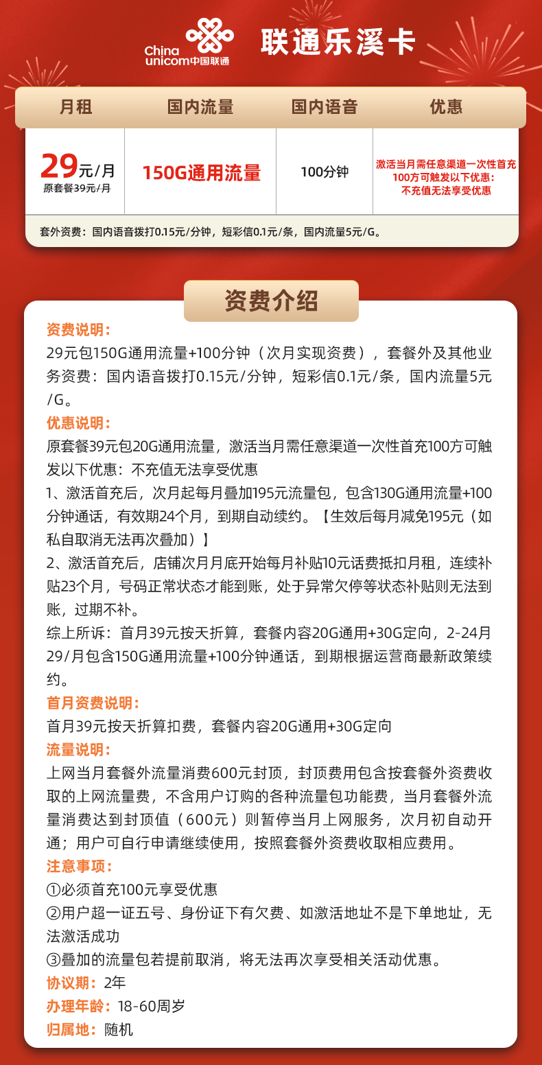 联通乐溪卡29元150G+100分钟(仅发浙江)