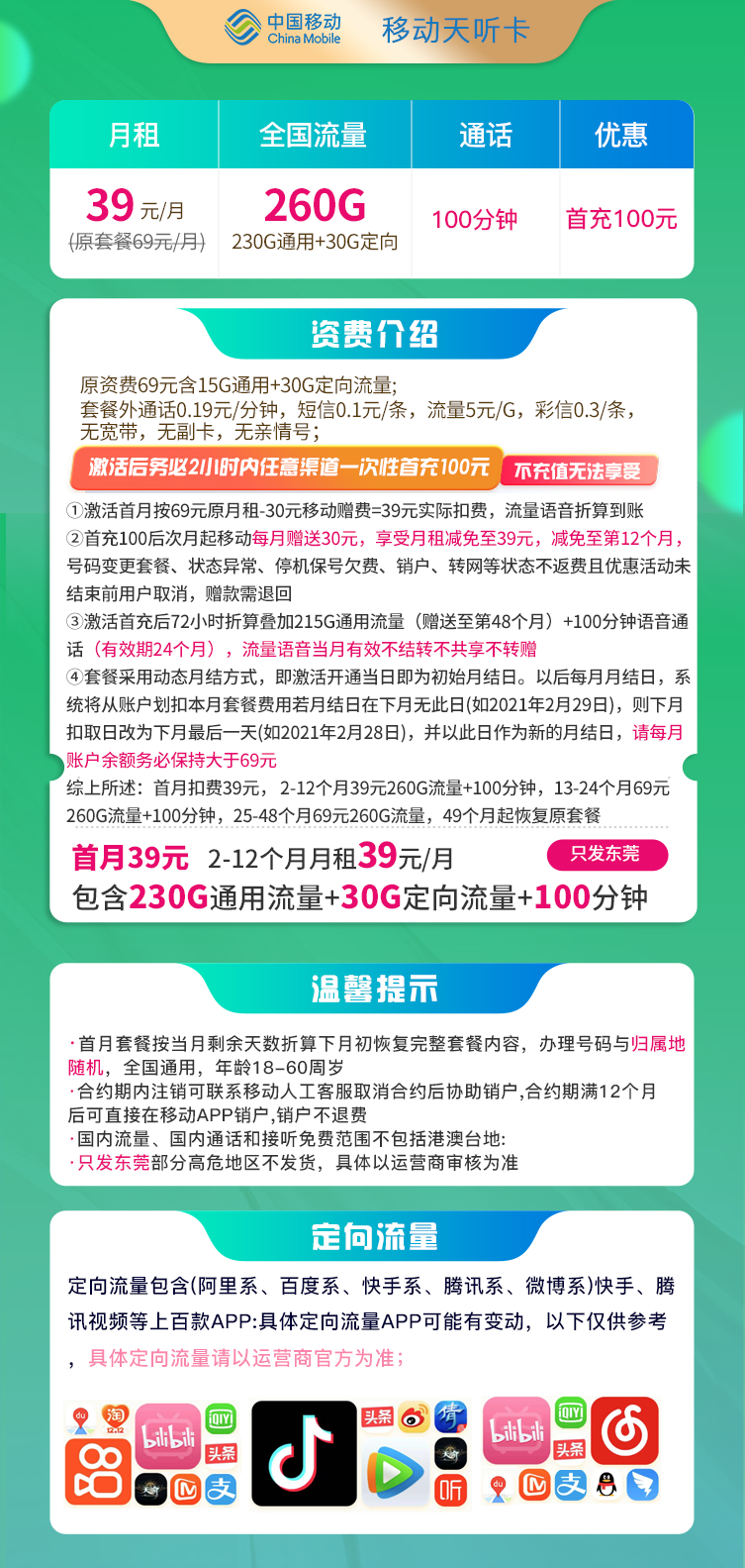 移动天听卡 39元260G流量+100分钟 只发东莞