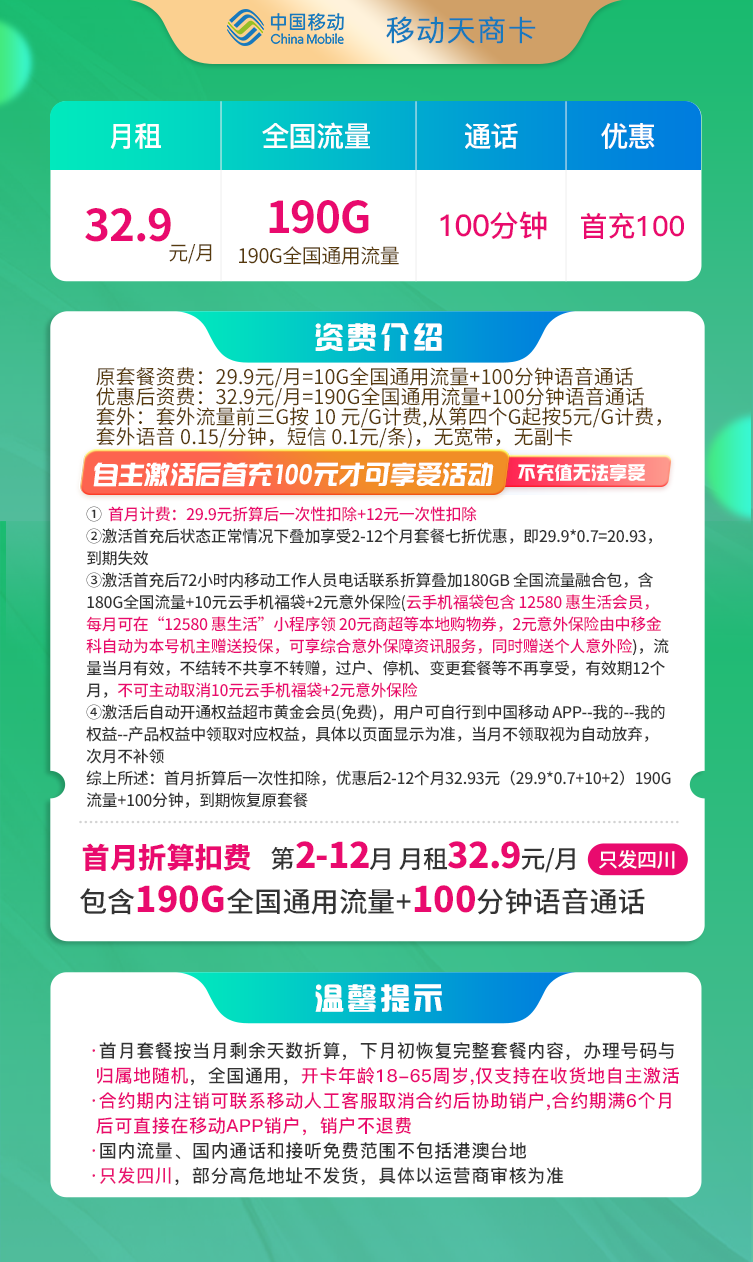 移动天商卡 32.9元190G通用+100分钟 只发四川