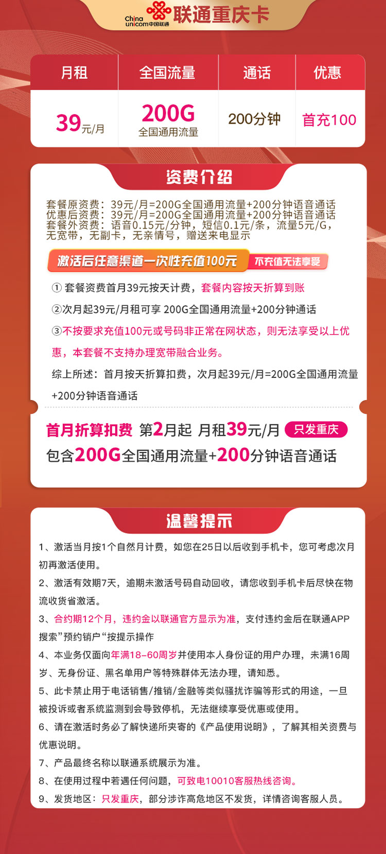 联通重庆卡 39元200G通用流量+200分钟通话 只发重庆