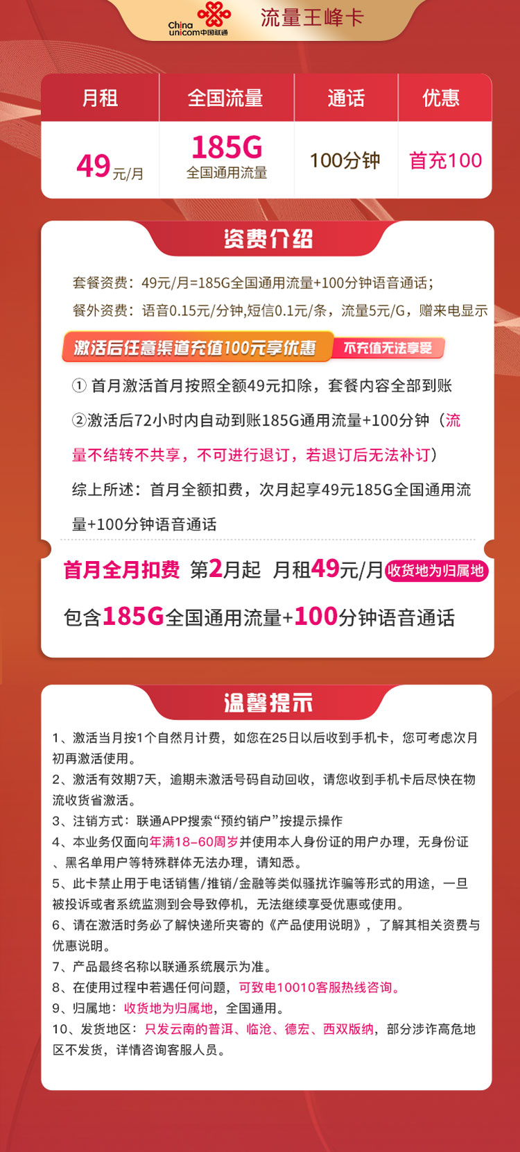 流量王峰卡 49元185G流量+100分钟 收货地为归属地 只发云南