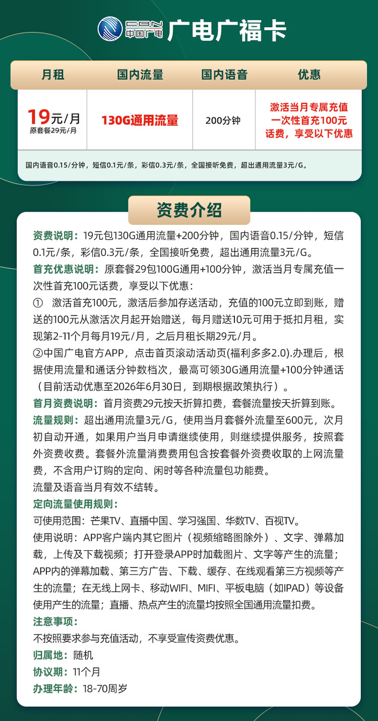 广电广福卡 19元包130G通用流量+200分钟通话(发全国)