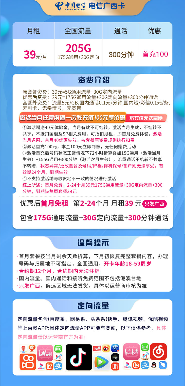 电信广西卡 39元205G流量+300分钟 只发广西