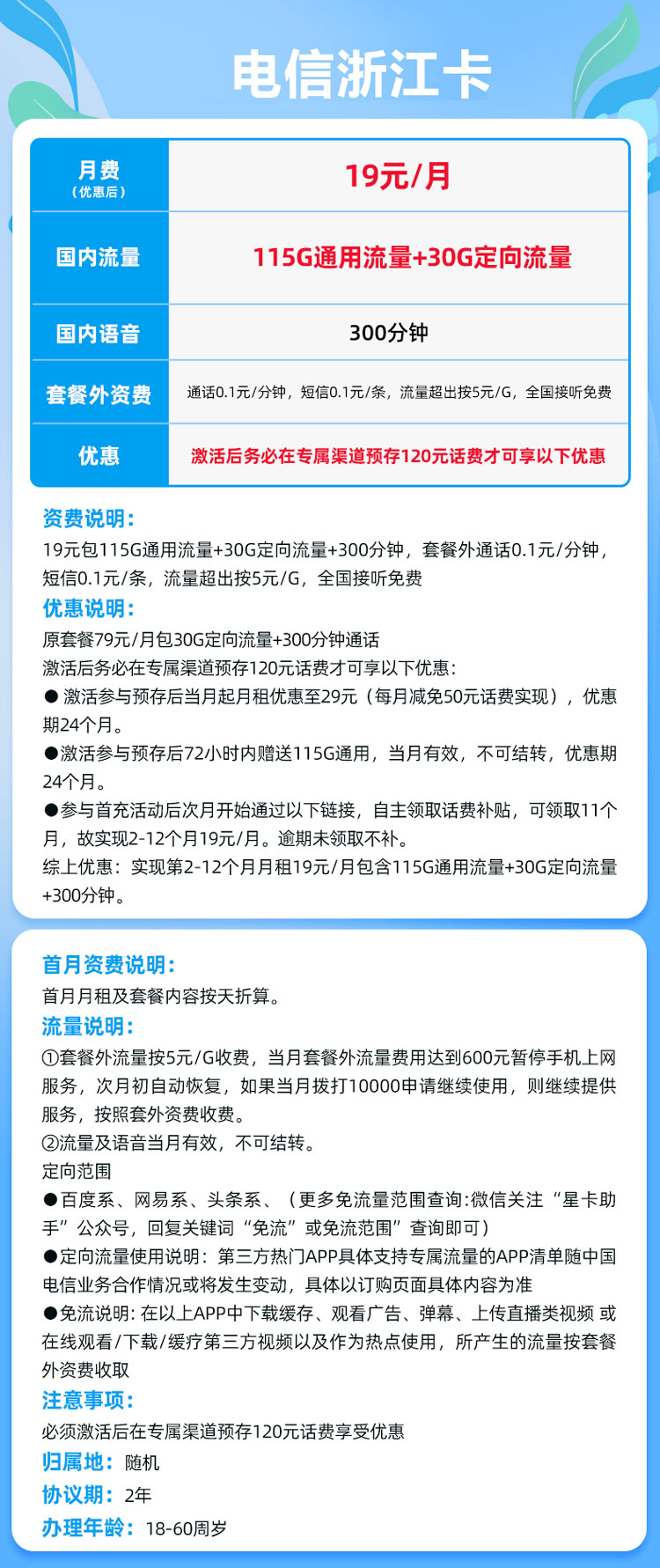电信浙江卡19元包115G通用流量+30G定向流量+300分钟(仅发浙江)