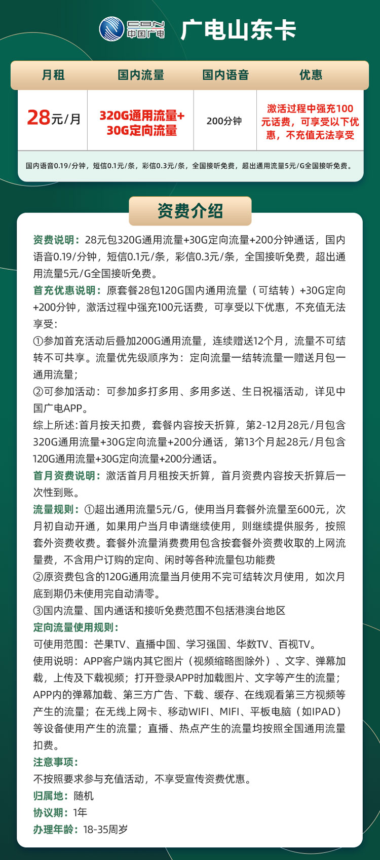 广电山东卡 28元包320G通用+30G定向+200分钟通话(仅发山东)