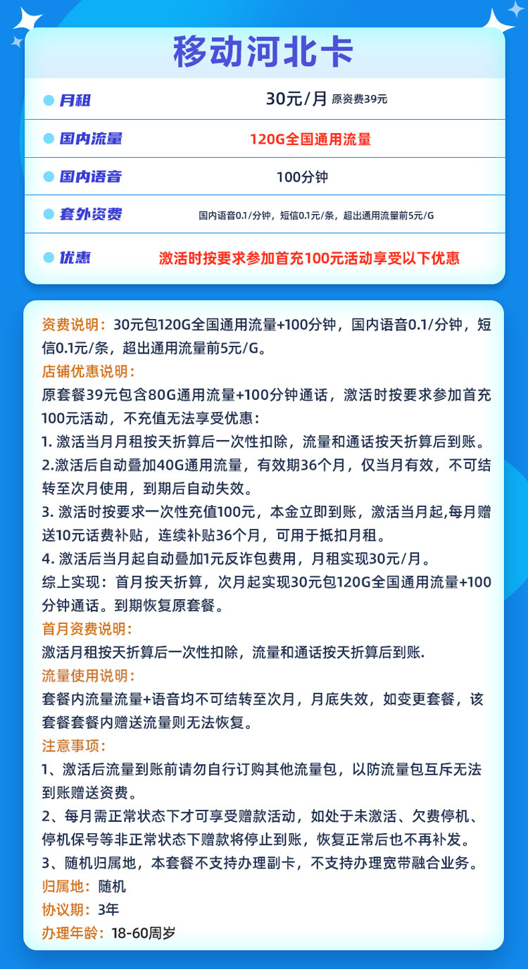 移动河北卡 30元包120G全国通用流量+100分钟(仅发河北)