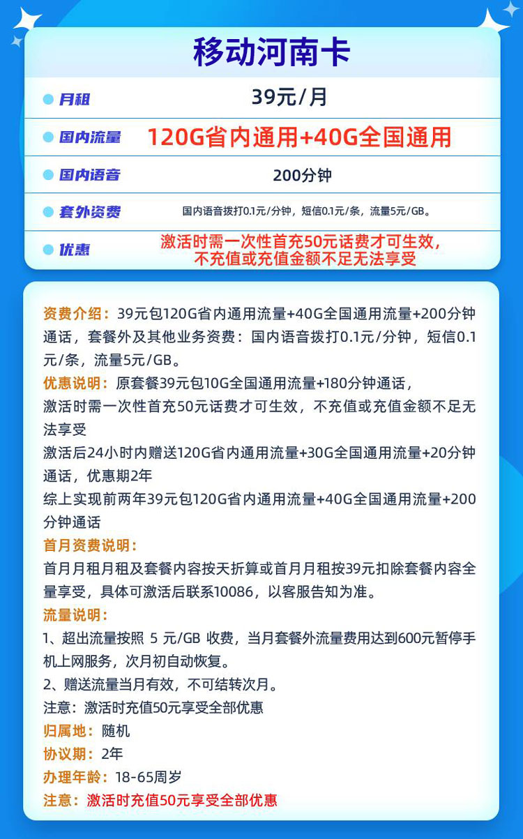 移动河南卡 39元包120G省内通用流量+40G全国通用流量+200分钟通话(仅发河南)