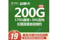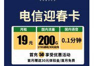 电信迎春卡:月租19元含170G通用+30G定向流量+0.1元/分钟通话