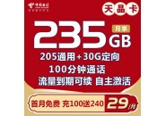 29元235G全国流量卡,电信天星卡29元包235G全国流量,首月免费体验