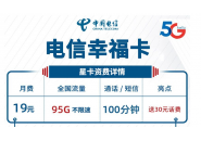 电信幸福卡套餐:19元月租95G流量+100分钟通话...