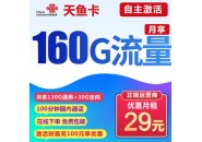 联通天鱼卡套餐介绍:月租29元包160G通用流量+100分钟通话...