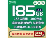 电信天兴卡,电信29元185G流量+100分钟,长期资费到期可续...