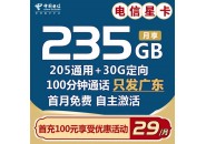 广东电信星卡29元流量版:29元235G全国流量+100分钟...