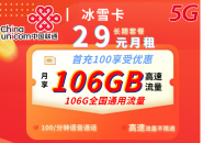 联通冰雪卡:29元106GB通用流量+100分钟通话