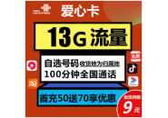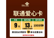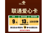 联通爱心卡:月租9元包含13G流量+100分钟通话