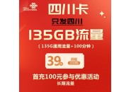 四川联通流量卡,39元135G通用流量+100分钟,套餐长期可用!